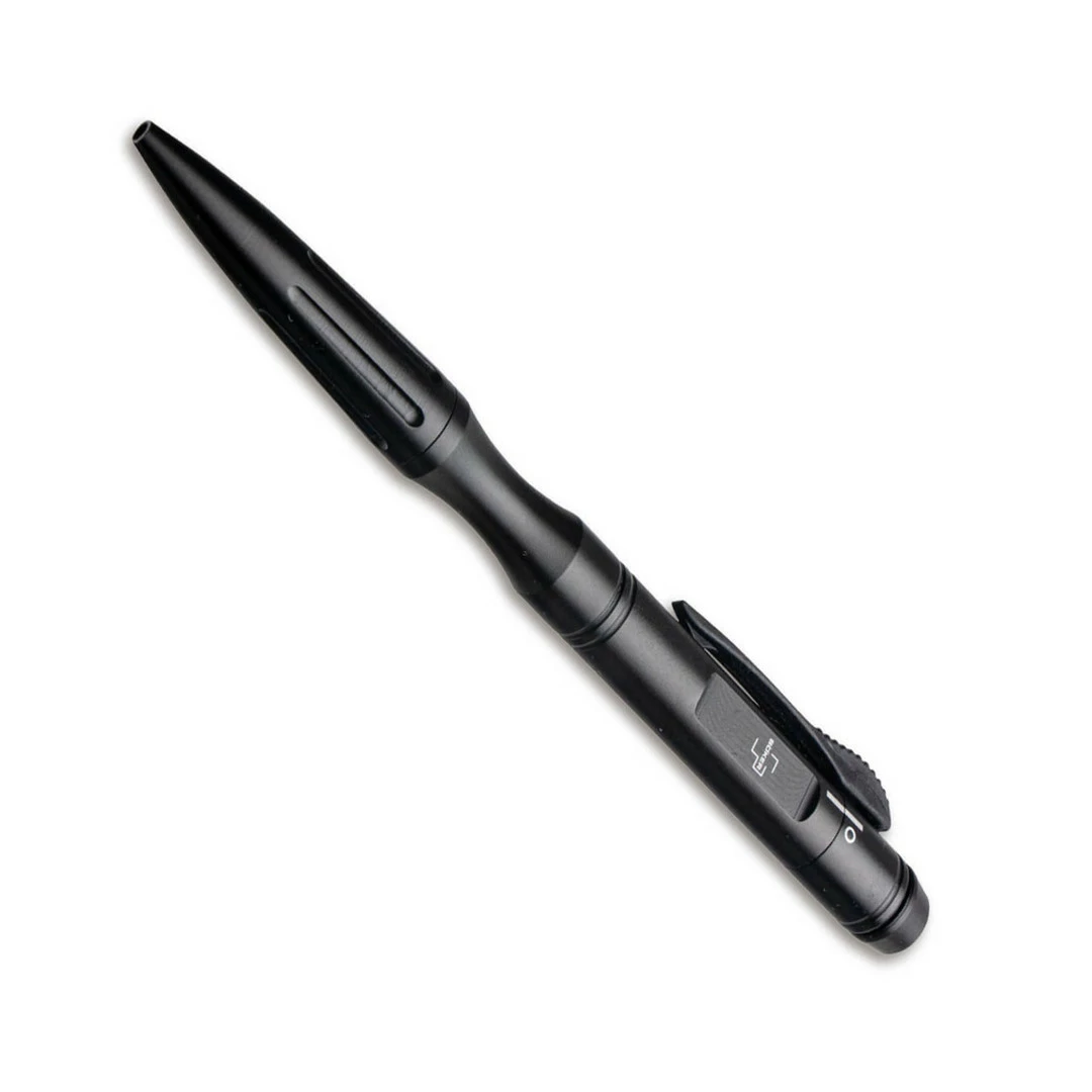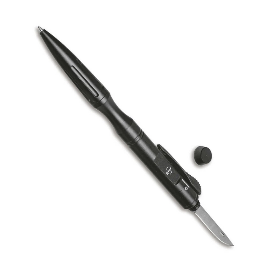 The Boker Plus OTF Pen will be a unique addition to your pen collection. This two in one combines a black ink pen with a concealed D2 knife, making this useful for all areas of the office and at home. The OTF comes with a twist lock to prevent accidental firing, and a fully closed replaceable cap to add an extra measure of safety and secrecy. The pocket clip doubles as the blade trigger.