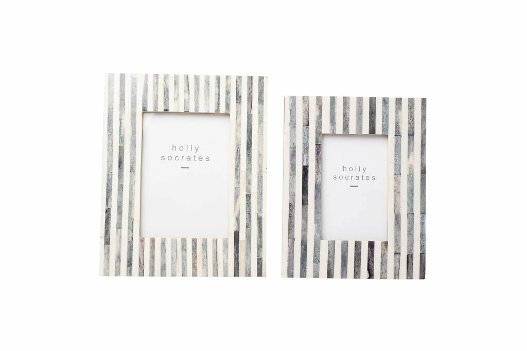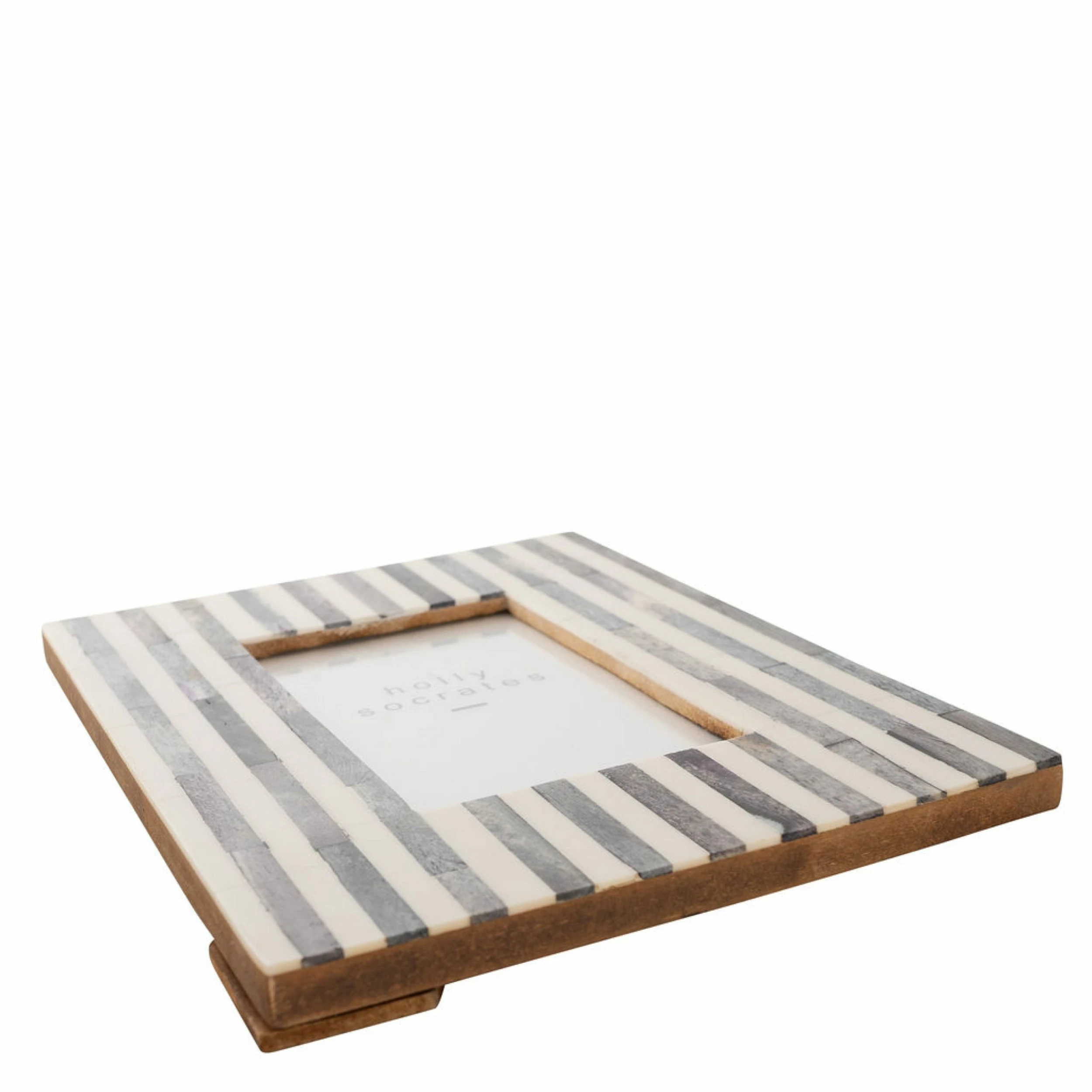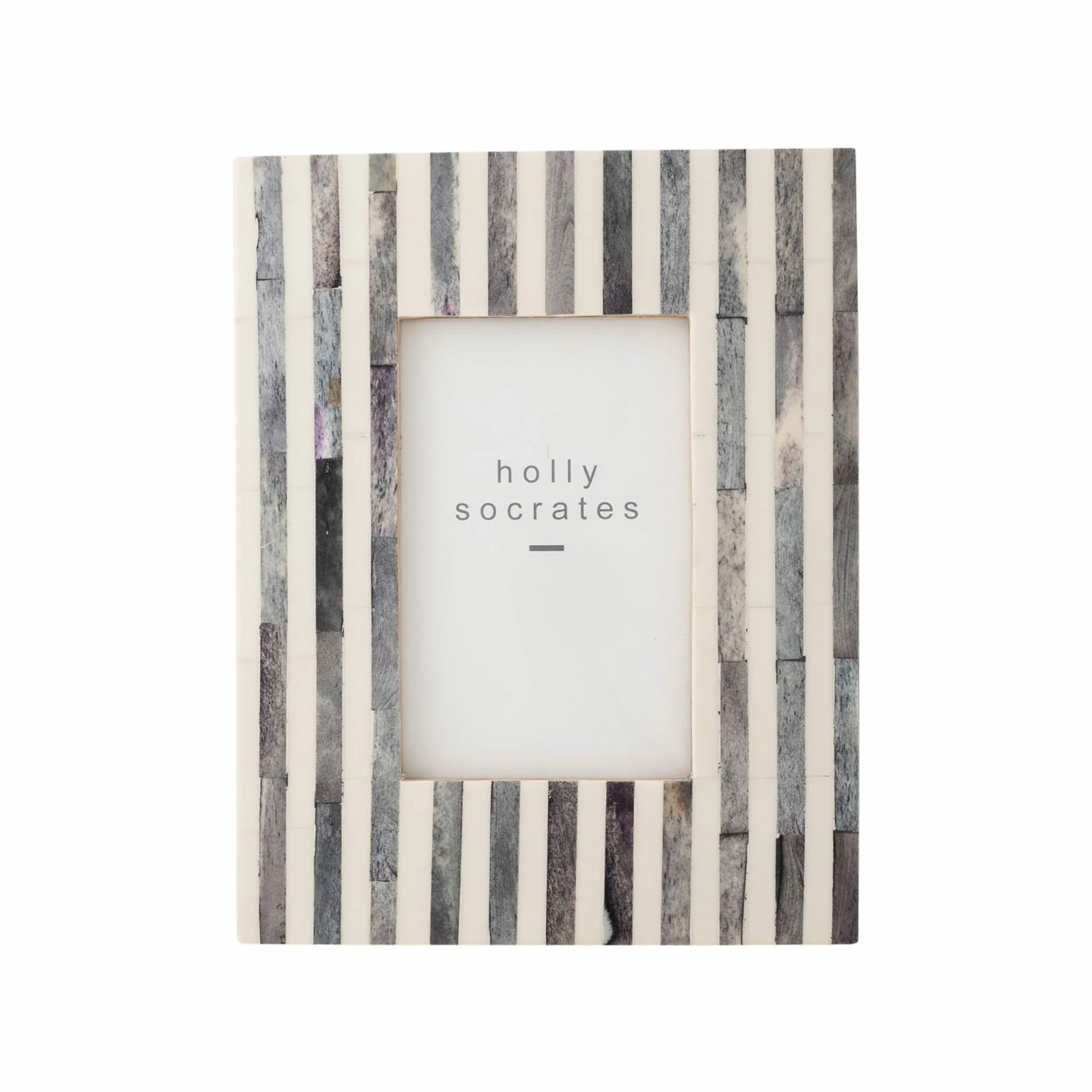 Bone inlay frame bengal stripes in tones of blue grey and ivory. Measures 9.5” X 7.5” and can be displayed vertically or horizontally. Fits photo size 4” x 6” with a 3.5” x 5.5” opening.