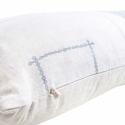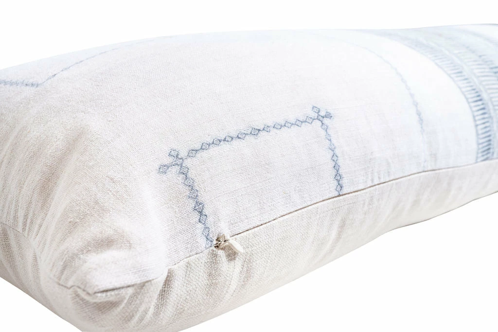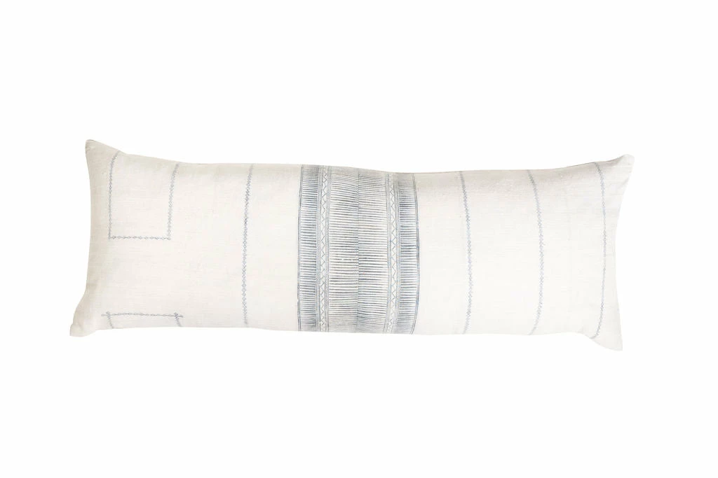 Made from vintage Hmong and hemp linen. Grey print. 13″ x 35″. Zipper closure. Includes down filled pillow insert.