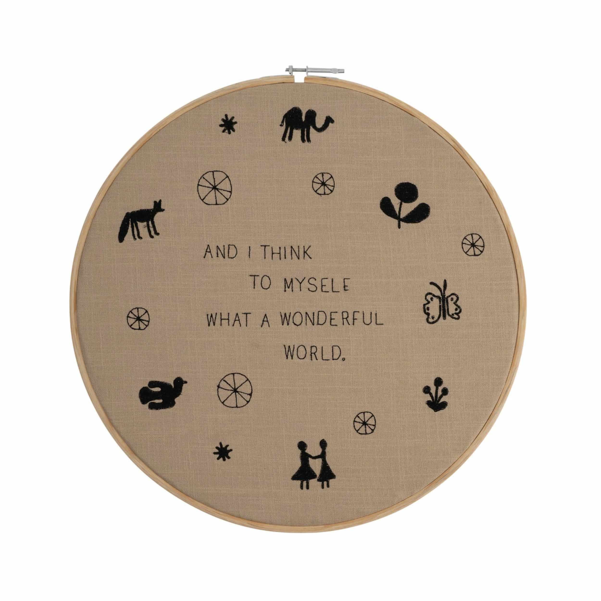 These charming embroidery hoops or machine-sewn on natural linen and held by a wooden hoop. 18” Diameter.