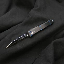 This custom out-the-front model features a hefted anodized aircraft alloy handle and a dagger style blade in a “cracked ice” mirror polish finish.