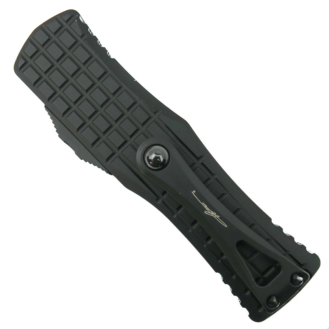 This Microtech Knives Hera Signature Series OTF automatic knife features a two-toned M390 dagger blade.