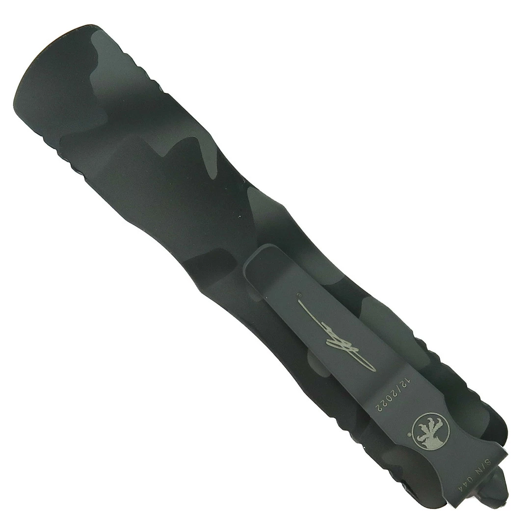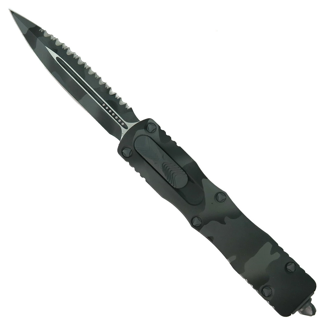 This Microtech Dirac Signature Series out-the-front knife features an urban camo Mil-Spec hard anodized finished handle and a dagger blade with one fully serrated edge and one standard edge. The blade has a matching urban camo finish.