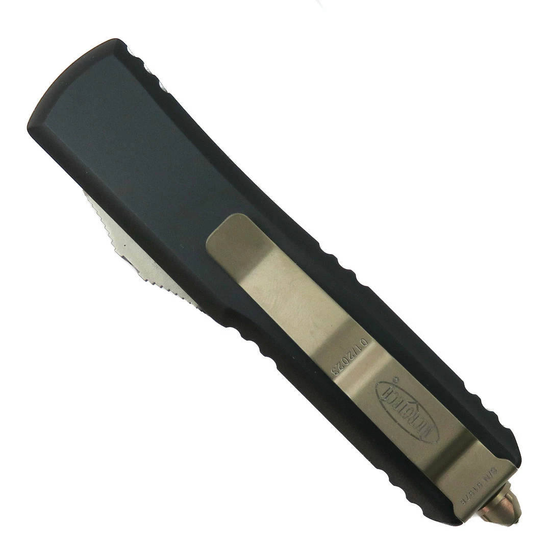 This Microtech Spartan UTX-85 OTF Auto knife boasts a black anodized handle complete with standard black hardware and an integrated glass breaker function along with a bronze finished double tanto “Spartan” style blade.
