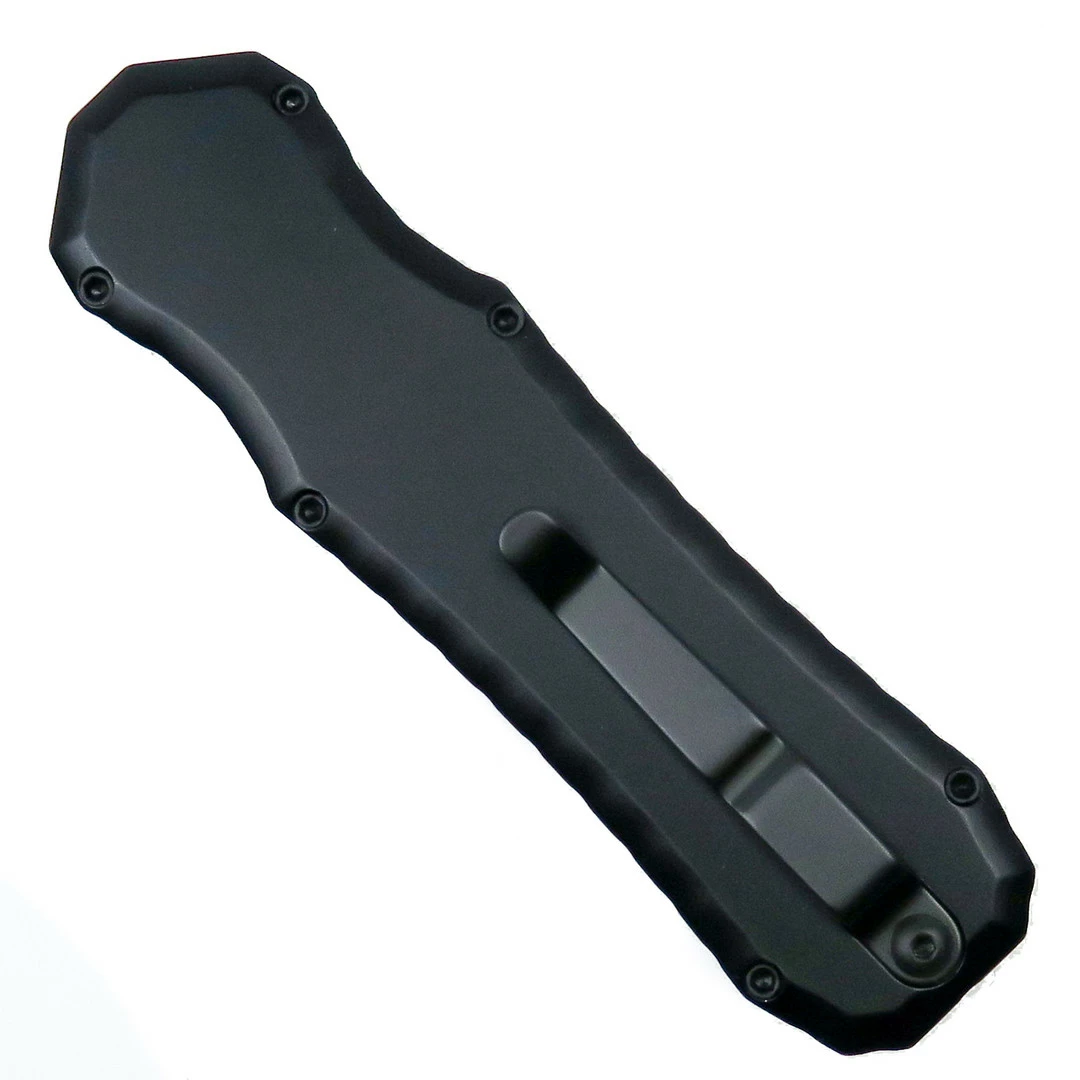Piranha knives have certainly made their mark in the automatic knives arena for their tight tolerances, consistent quality and competitive pricing. Thanks to their unique custom-like anodized handle colors and a multitude of knife models with their respective blade variations, Piranha can most certainly appeal to every knife user. All models feature all-stainless steel hardware in addition to a titanium pocket clip. The Excalibur, which is Piranha’s only double action out the front automatic knife, showcases aircraft grade aluminum handle scales that have been chamfered, rounded and polished for a comfortable and ergonomic feel. The handle scale boasts dual finger grooves on either side and the slide trigger has been placed on the broad side of the handle for maximum control. This model, the 8-BKT, features a black anodized handle, a dagger style blade in a black finish and the pocket clip is statically designed for tip down carry only on the traditional side of the handle. Made in the USA.
