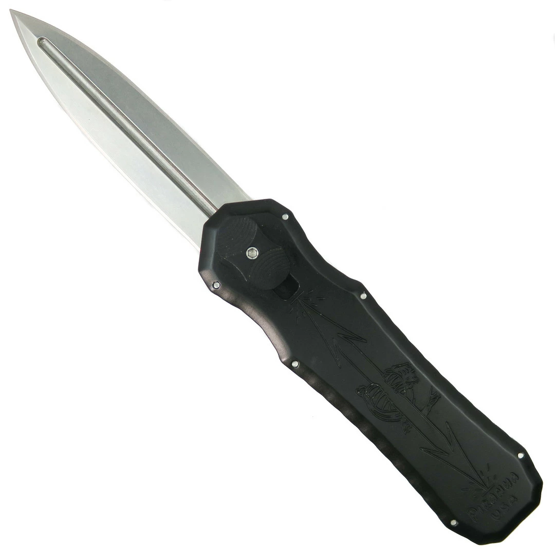 Piranha knives have certainly made their mark in the automatic knives arena for their tight tolerances, consistent quality and competitive pricing. Thanks to their unique custom-like anodized handle colors and a multitude of knife models with their respective blade variations, Piranha can most certainly appeal to every knife user. All models feature all-stainless steel hardware in addition to a titanium pocket clip. The Excalibur, which is Piranha’s only double action out the front automatic knife, showcases aircraft grade aluminum handle scales that have been chamfered, rounded and polished for a comfortable and ergonomic feel. The handle scale boasts dual finger grooves on either side and the slide trigger has been placed on the broad side of the handle for maximum control. This model features a black anodized handle, a dagger style blade in a stonewash finish and the pocket clip is statically designed for tip down carry only on the traditional side of the handle. Made in the USA.