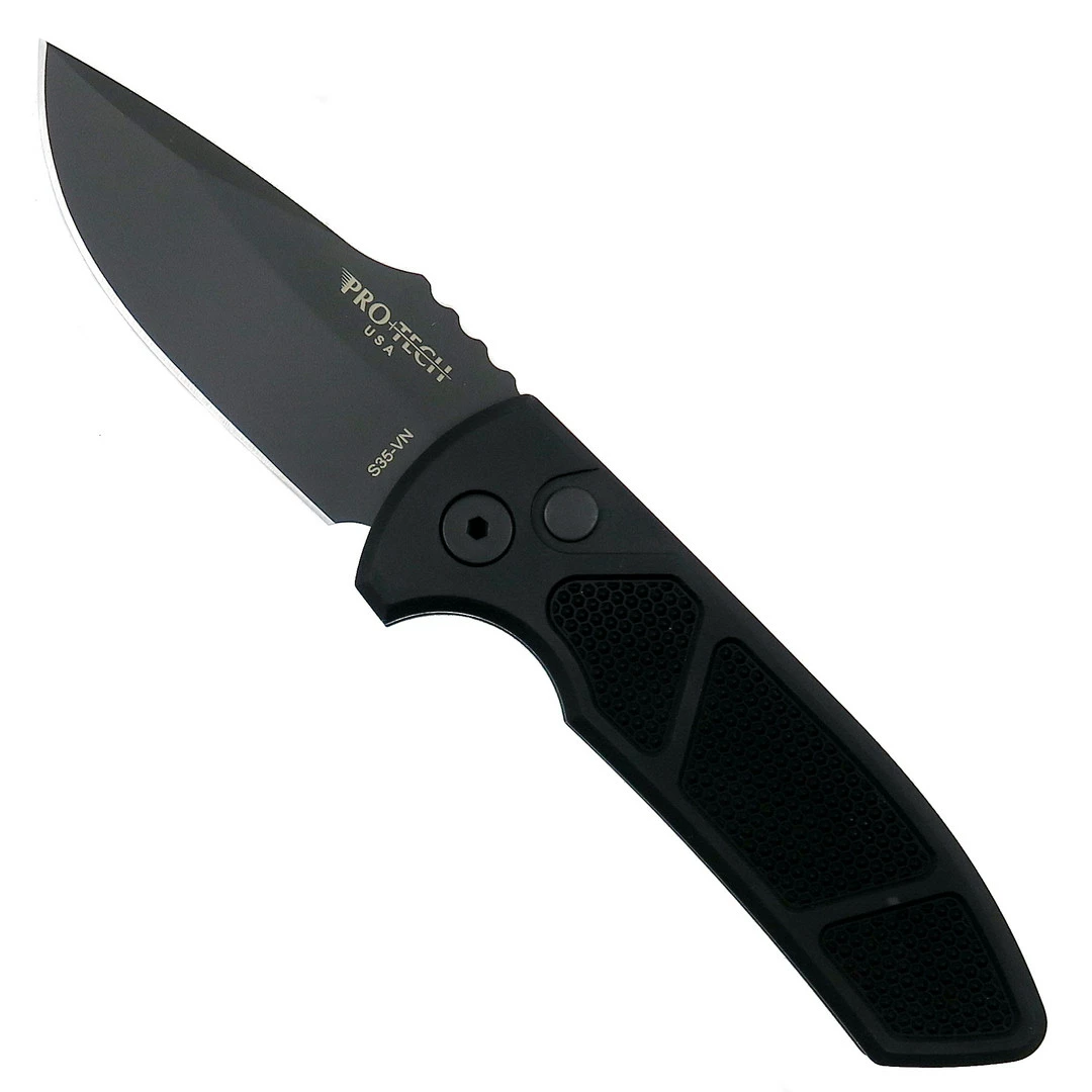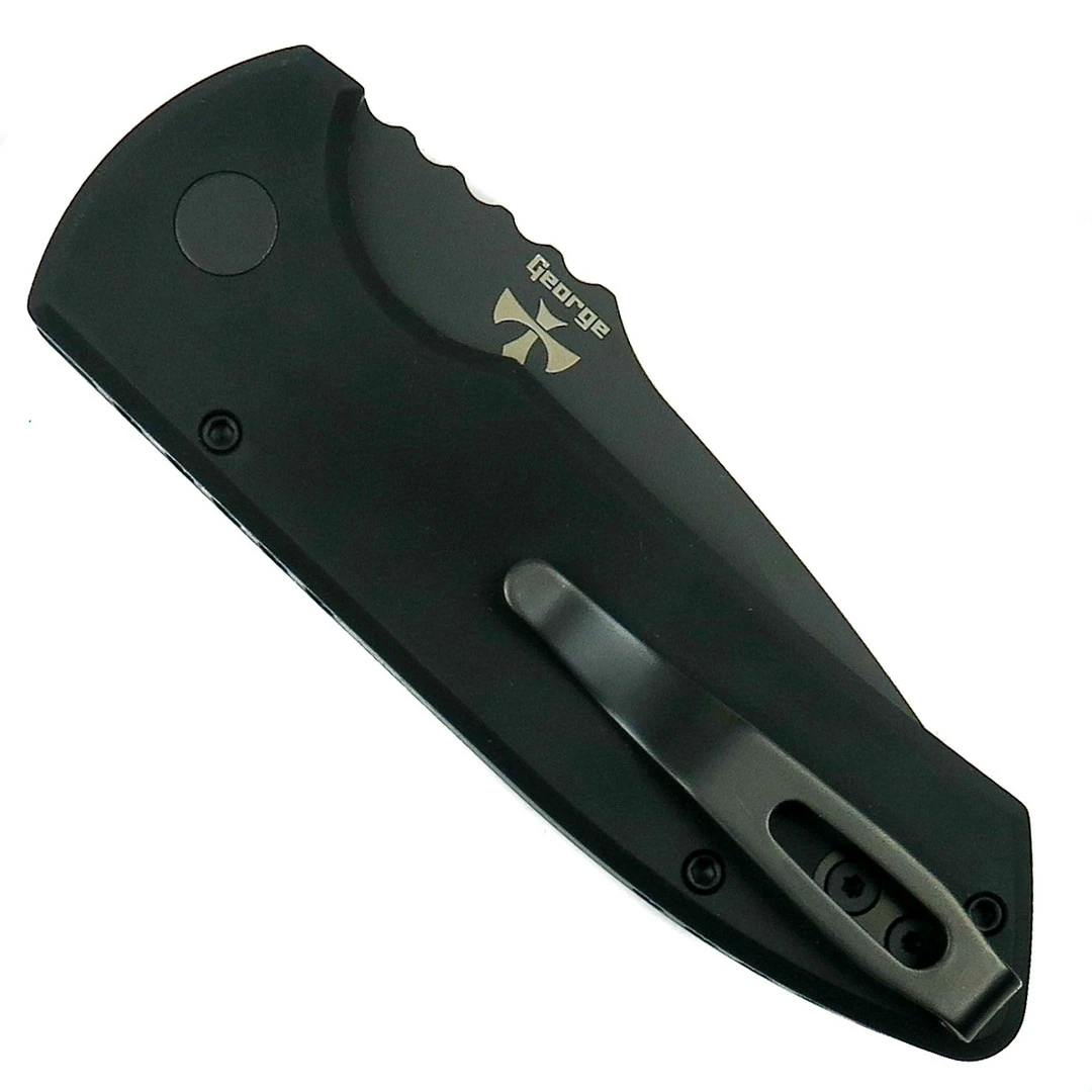 SHOT Show 2019 yielded some very impressive knives but the true front-runner is the Pro-Tech built and Les George designed SBR–short for Short Bladed Rockeye. Stemming from his Marine Corps background, the SBR is a shortened version of his popular Rockeye auto and boasts a stout 1/8″ thick blade stock. Built in 2 distinct variations, each model sports stylized pockets milled into the spine and the deep finger groove promotes excellent grip security. This model features a black anodized aircraft-grade aluminum handle with textured inlays, a drop point style blade in a DLC (Diamond Like Carbon) black finish and the deep carry pocket clip is statically designed for tip up carry only on the traditional side of the handle. Made in the USA.