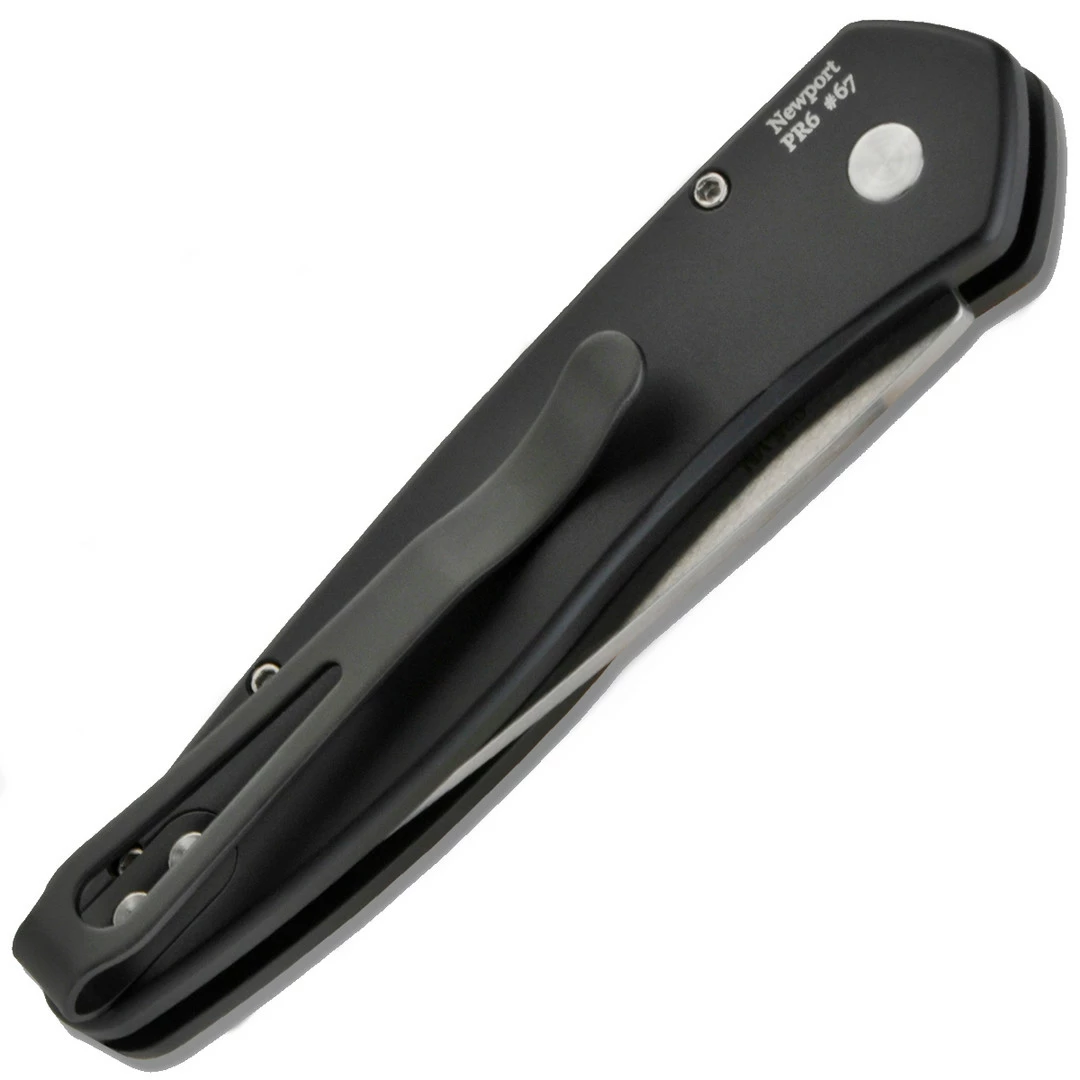 The Newport series by Pro-Tech is one of many automatic knife models they offer that blends the finest materials available with a supreme commitment to craftsmanship. Each small hand-crafted batch is built with the most modern high-tech manufacturing practices from the standard production models to their highly sought-after custom knives. This side open auto model opens with incredible speed and showcases a rock-solid lockup and offers a sleek and slim profile for a comfortable carry experience. This model features a black anodized aircraft handle complete with a single polished ivory micarta inlay, a spear point style blade in a stonewash finish and the pocket clip is statically designed for tip up carry only on the traditional side of the handle. Made in the USA.