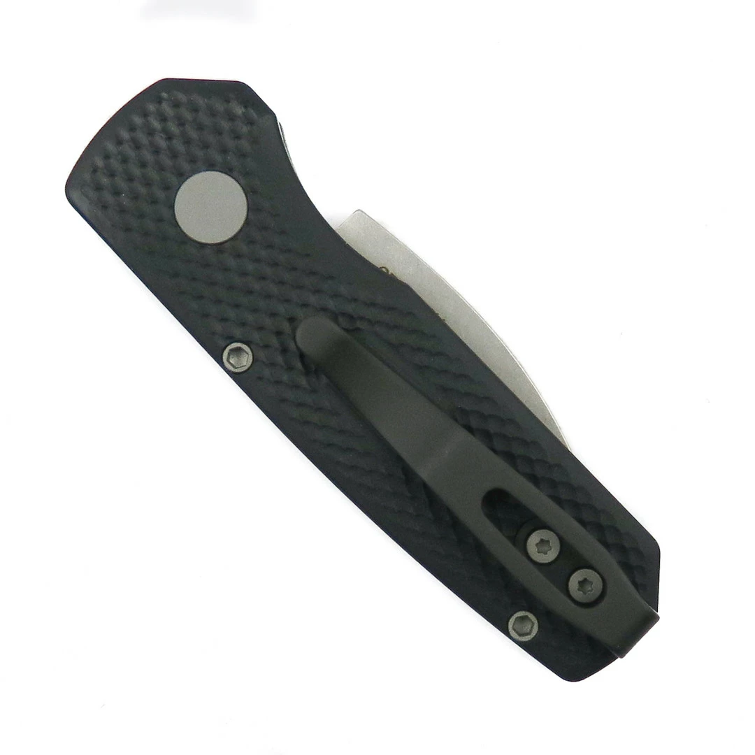The stonewash finished 20CV wharncliffe blade opens fast and locks up tight with classic Pro-Tech push-button action.