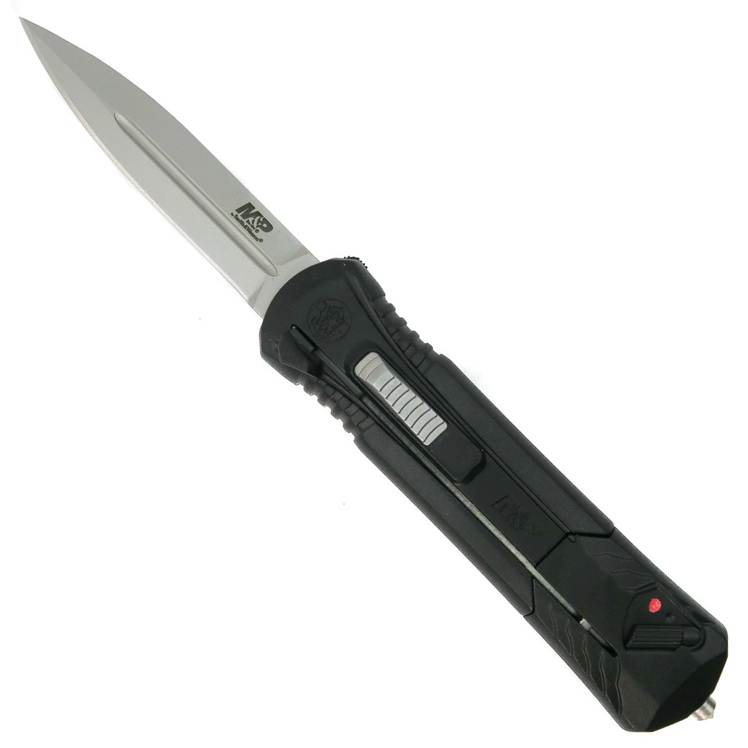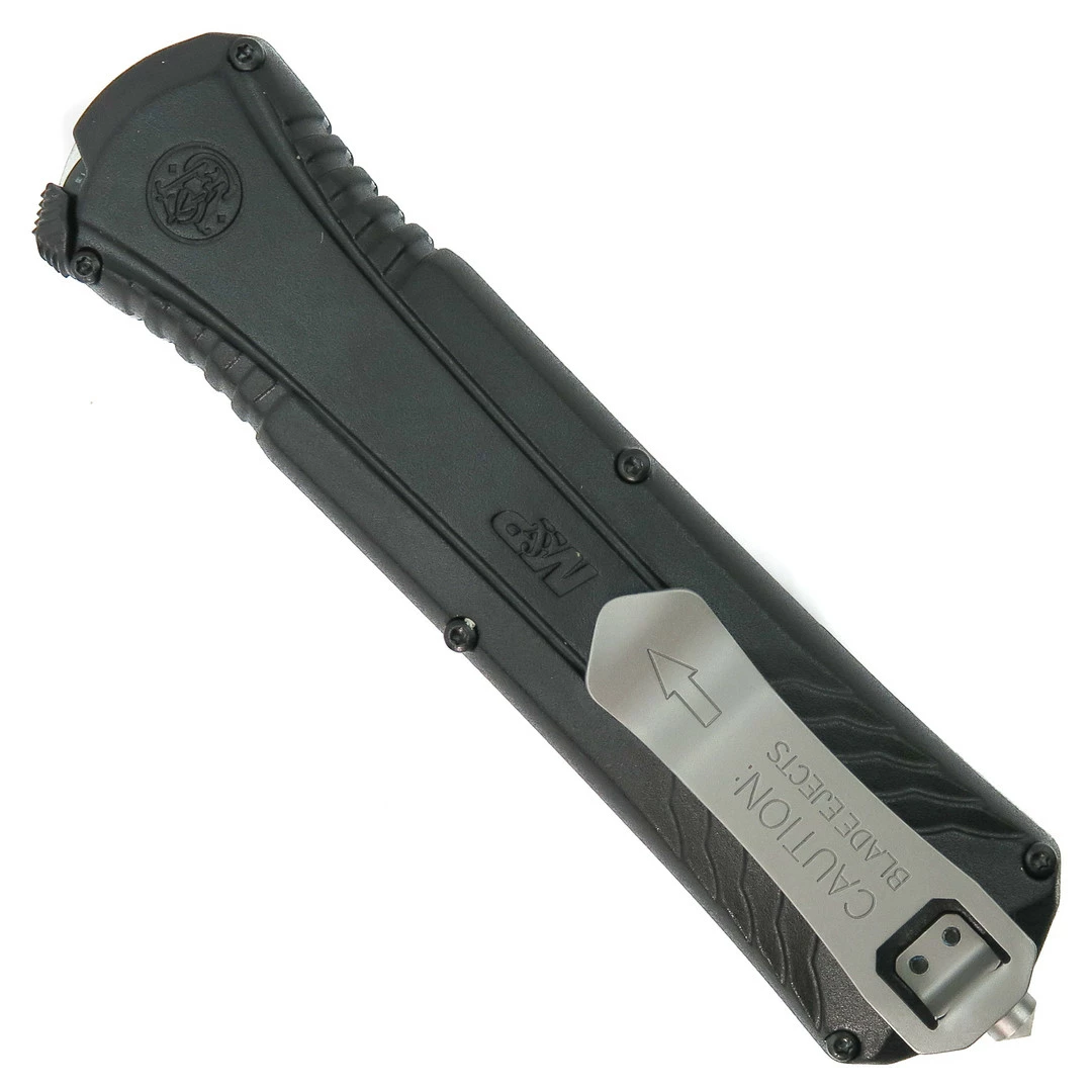 This Smith & Wesson Military & Police OTF 10 features an all black tactical look and a spear point blade with a great edge treatment. It also features an integrated glass breaker function and the pocket clip is statically designed for tip down carry only on the traditional side of the handle.