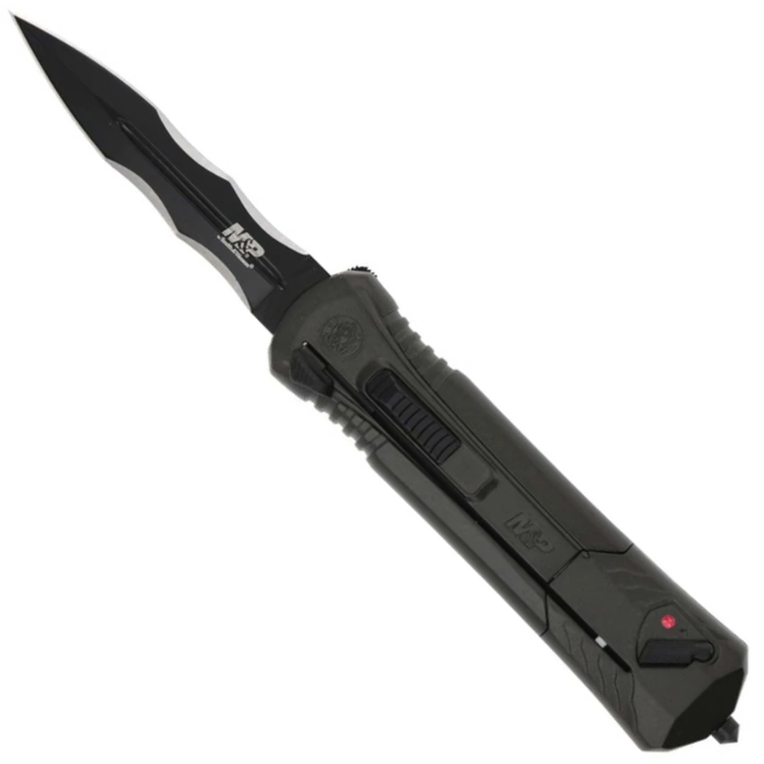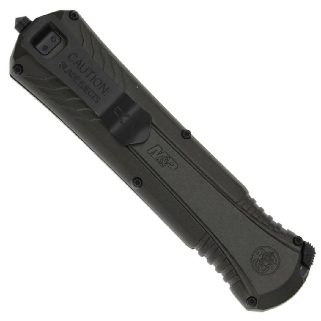 This Smith & Wesson Military & Police OTF 10 features an all black tactical look and a spear point blade with a great edge treatment. It also features an integrated glass breaker function and the pocket clip is statically designed for tip down carry only on the traditional side of the handle.